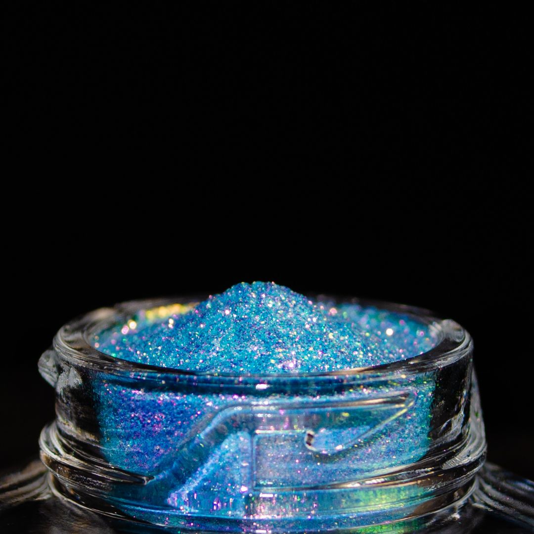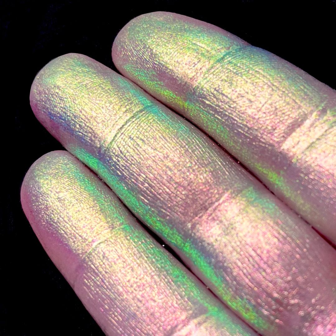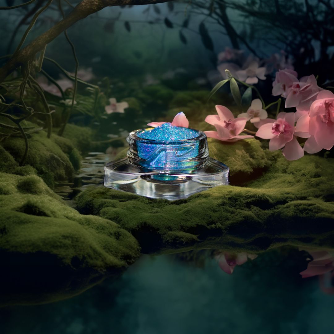 Introducing "Dreaming Orchid," a captivating multichrome eyeshadow pigment that transitions from deep indigo, reminiscent of midnight skies, to a soft pinky peach, like blooming orchids, and finally to a serene jade, echoing lush rainforests. Let this enchanting blend of colours add a touch of natural beauty and tranquility to your look.
